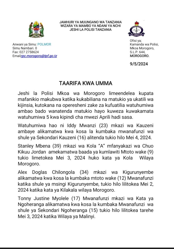 News Jeshi la Polisi Morogoro laendelea kupambana na Ukatili wa Kijinsia. Last updated: May 10, 2024 11:49 am Togoro Media Share 0 Min Read SHARE Share This Article Facebook Twitter Copy Link Print Leave a comment Leave a Reply Cancel replyYour email address will not be published. Required fields are marked *Comment * Name * Email * Website Save my name, email, and website in this browser for the next time I comment. Latest News Wanaanga Wa Artemis II Warejea Duniani Salama Technology April 11, 2026 Bei Ya Mafuta Duniani Yazidi Kupanda News April 9, 2026 Angela Kizigha Na Eveline Waapishwa Bungeni Politics April 9, 2026 Zijue Injini Za 1G Beams 2000 Technology April 1, 2026