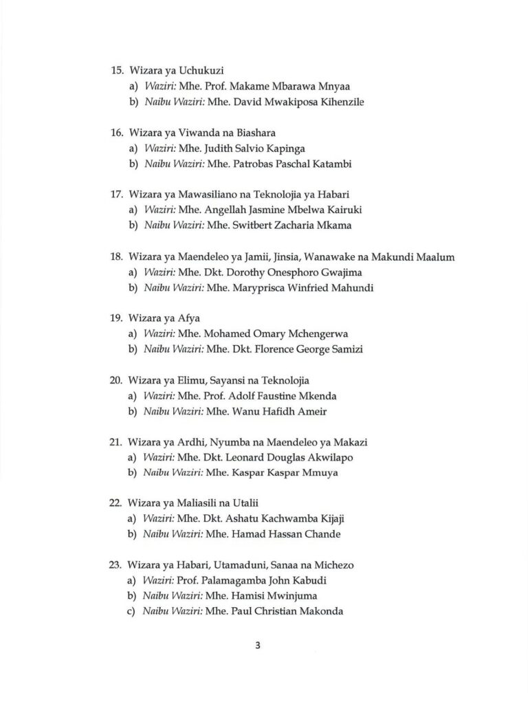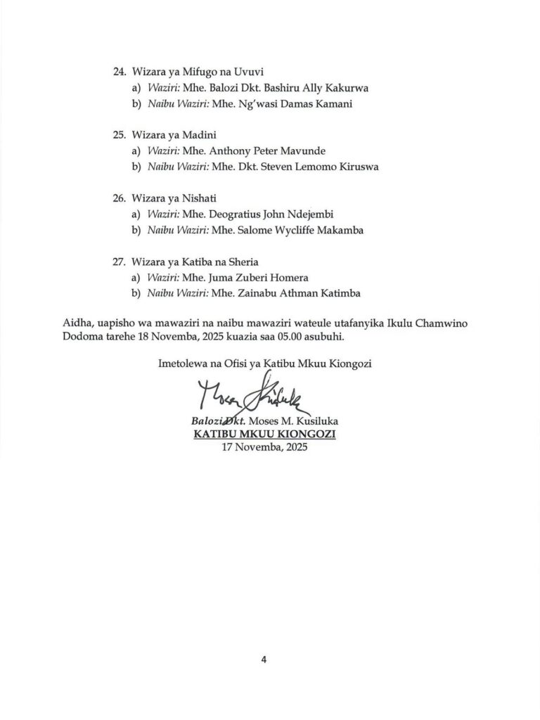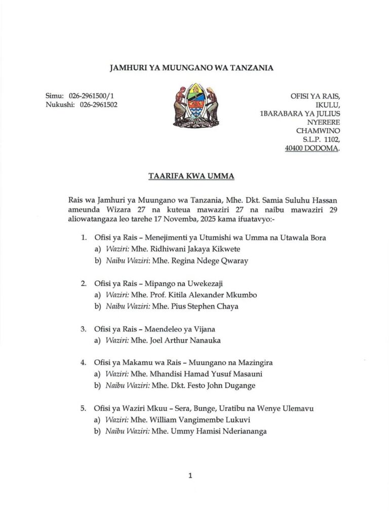 Leo Novemba 17, 2025 Rais wa Jamhuri ya Muungano wa Tanzania ametangaza Baraza jipya la Mawaziri huku akiteua Mawaziri 27 na Naibu Mawaziri 29 kama inavyoonekana hapo chini